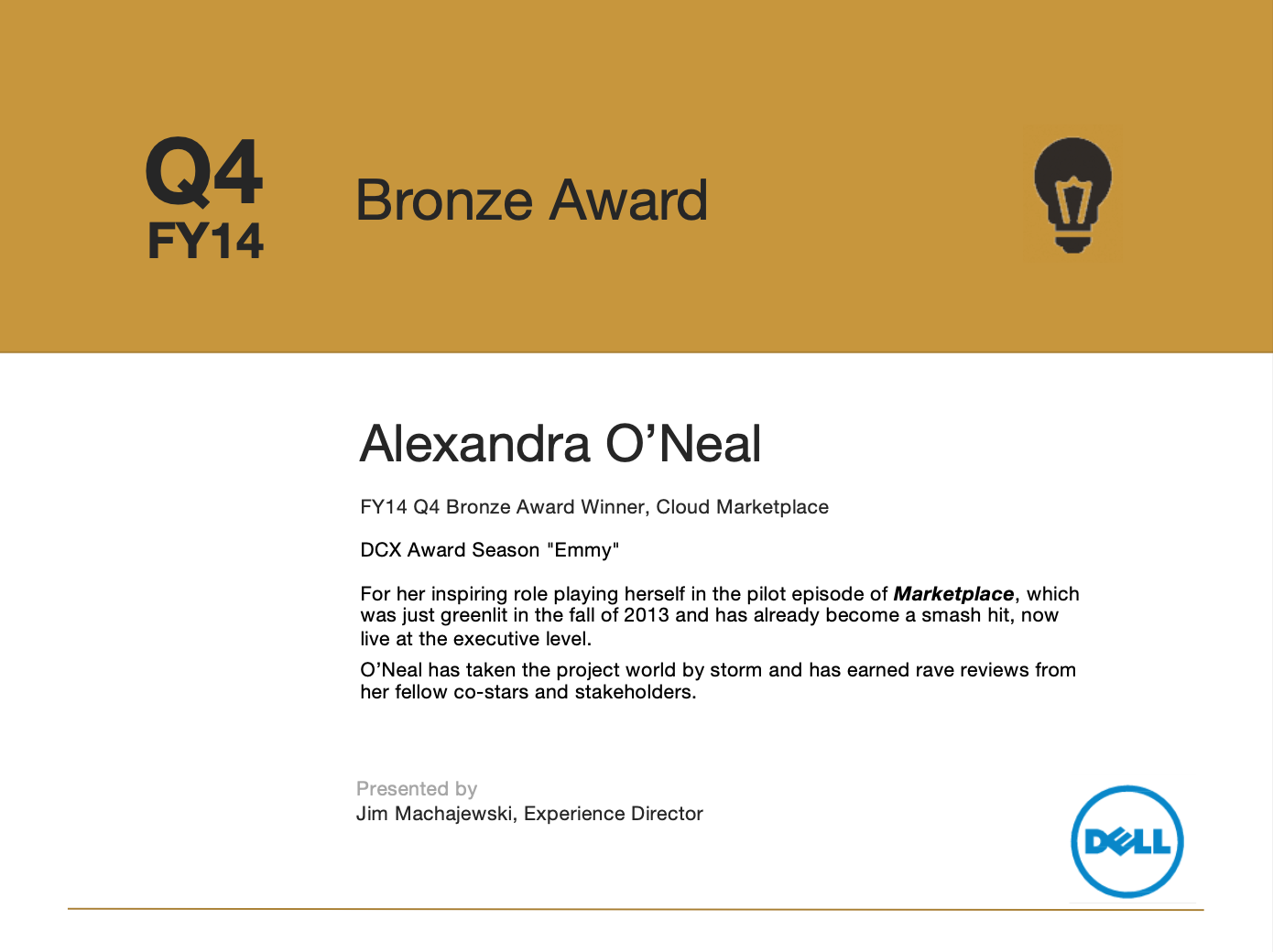 After almost a year of work, the project ended. Dell was moving in a different direction, and rather than make a standalone cloud marketplace, add-on options were added to the DCM platform as upgrades. But before it ended, awards were given, and Subbu recommended me for a Platinum award. These were precious, as they were approved by Michael Dell himself; I was told there were only 8 given that year, in a company of about 115,000 people. The cost was split between Dell Software Group and Dell Ops.