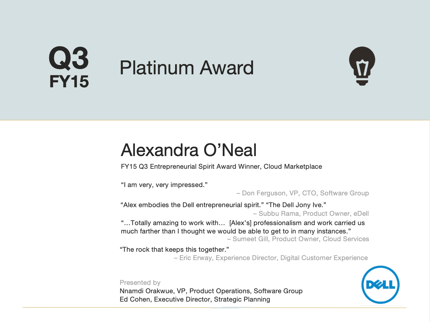 Dell allowed for recognition from peers and other departments, and my two awards both came from my biggest project there, Dell Cloud Marketplace, for which I was lead UX architect for not quite a year.