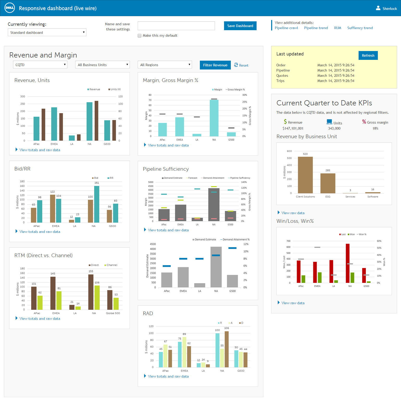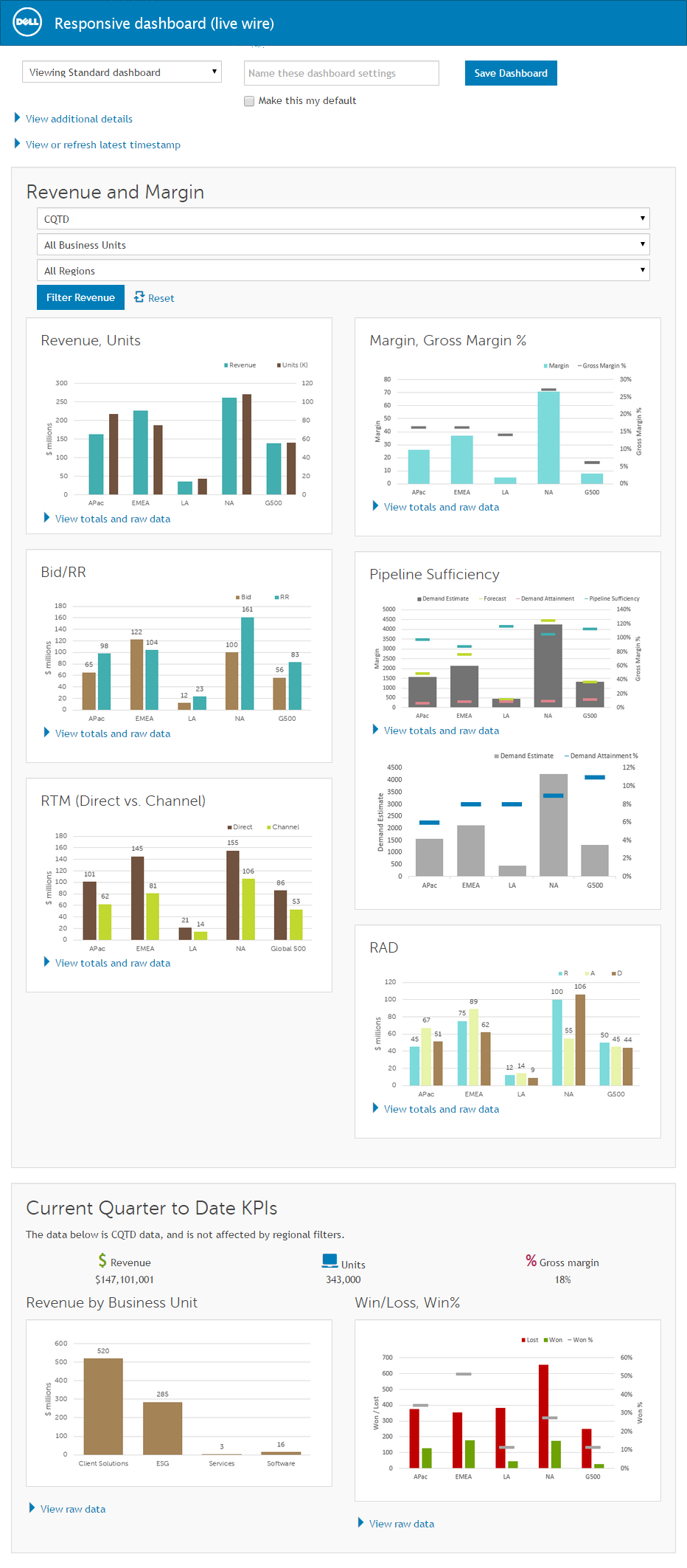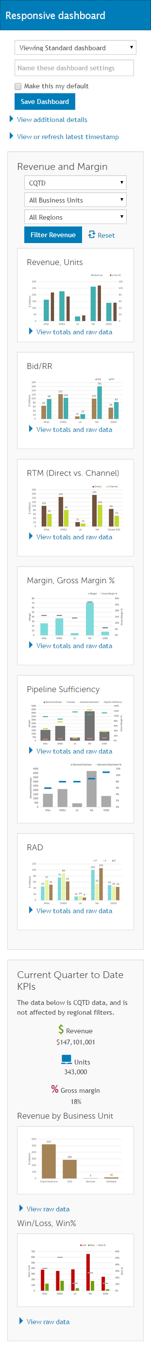 - Viewers can filter data by time frame, region, and business unit. They can also save filter settings and choose to make a specific filter setting their default.